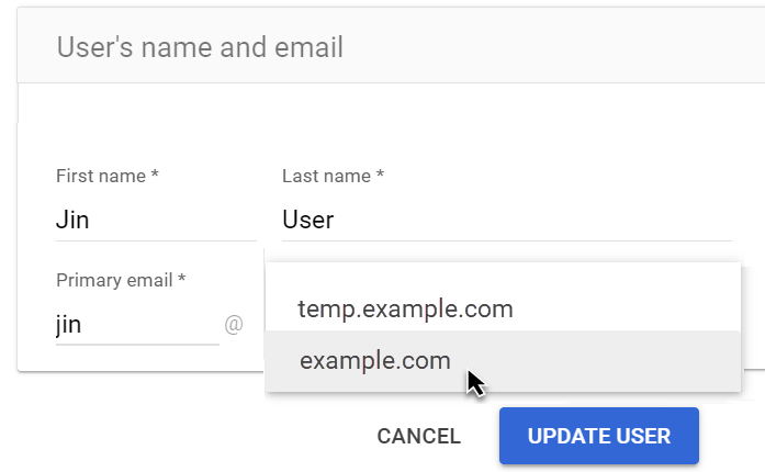 Dans votre nouveau compte Google Workspace, remplacez le domaine principal temp.example.com par example.com.Modifiez ensuite les adresses de vos utilisateurs afin d'utiliser example.com.