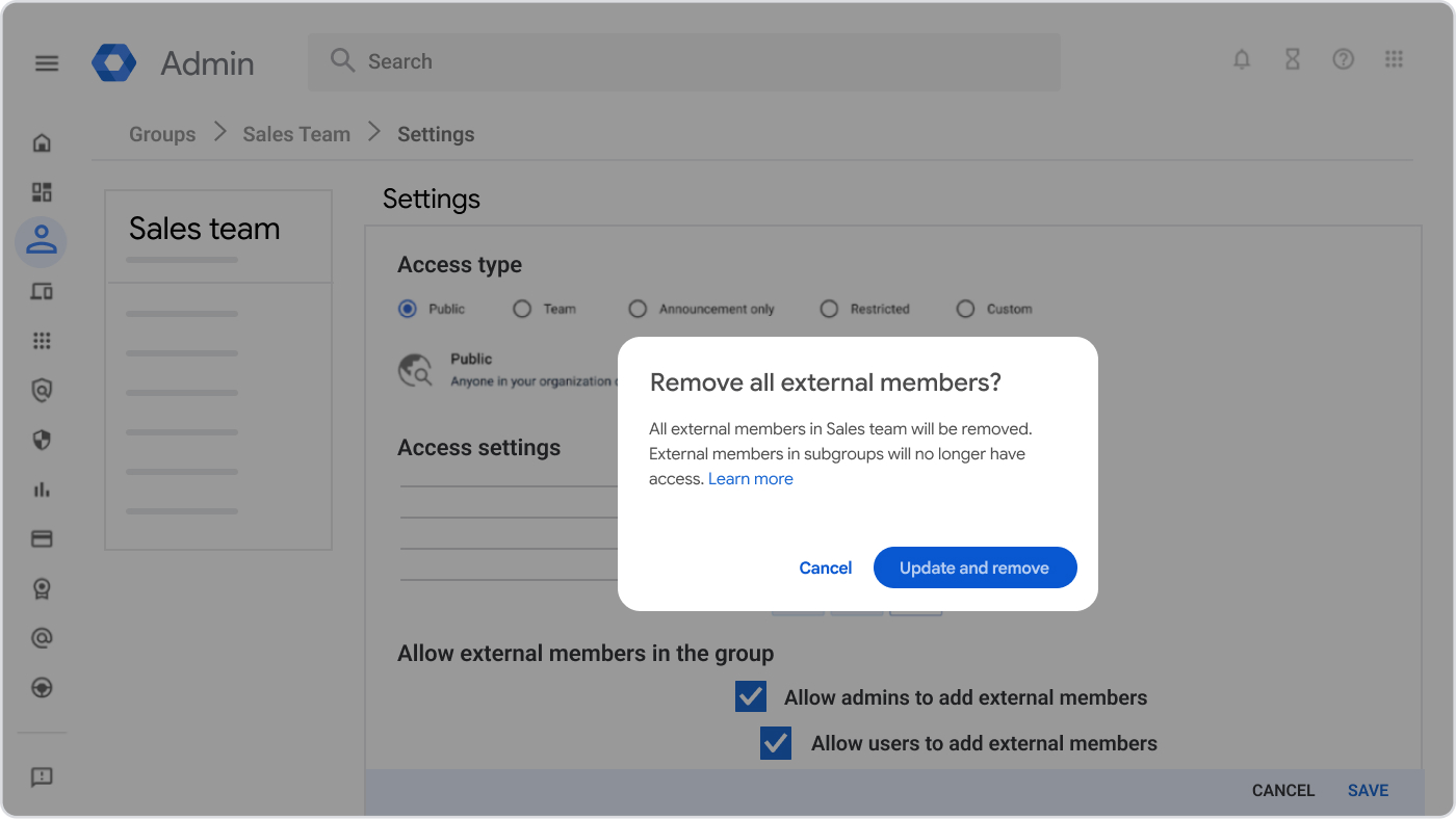 - Rimozione dei membri esterni quando la classificazione del gruppo viene modificata in interna: in modo simile a Google Gruppi, se un amministratore modifica la classificazione di un gruppo da esterna a interna dalla Console di amministrazione, i membri esterni verranno rimossi definitivamente. Verranno visualizzati i seguenti messaggi di avviso: