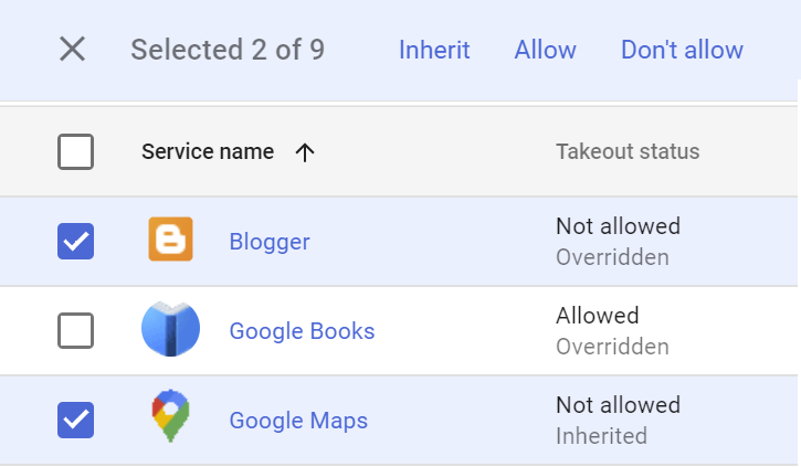 - Nos serviços com controle individual, verifique se os usuários estão incluídos em uma unidade organizacional ou um grupo de configuração em que o Google Takeout está definido como Não permitido.